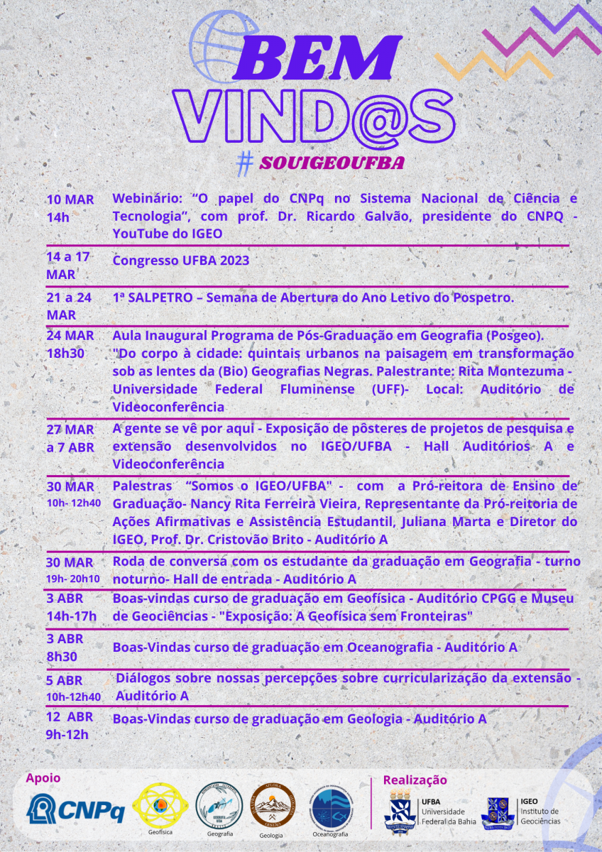 Acolher, integrar e apresentar o Instituto de Geociências da UFBA (IGEO/UFBA). Esta é a proposta da semana de boas-vindas que será realizada no IGEO nos meses de março e abril de 2023. O evento visa aproximar os estudantes da estrutura organizacional do Instituto e contará com a participação de representantes da Pró-Reitoria de Ensino de Graduação, da Pró-Reitoria de Pesquisa e Pós-Graduação e da Pró-Reitoria de Ações Afirmativas e Assistência Estudantil.